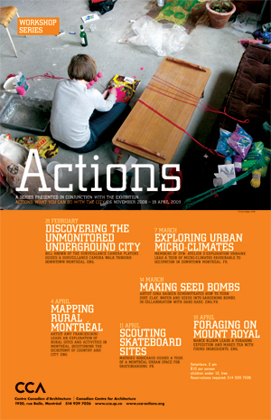 http://www.cca.qc.ca/en/education-and-events/419-exploring-urban-microclimates The activities of SYN- have led to various urban interventions: Hypothèses d’amarrages (Les Commensaux / Skol, Montréal, 2001-2008>), Hypothèses d’insertions 1-2-3-4 (Houseboat-Occupations symbiotiques / Axenéo7, Hull-Gatineau, 2002 ; État d’Urgence / ATSA, Montréal, 2006 ; Interstices urbains temporaires / RDS, ISCRA Rhône, Atelier d’architecture autogérée, Paris, France, 2007; Espace Mobile, Centre de l'image contemporaine Vox, 2008); Prospectus ( Canadian Centre for Architecture, CCA-extra-muros, 2003-2004, and Biennale de Montréal, 'Agora, the public domain', 2004), completed with the collaboration of designer Louis-Charles Lasnier ; Conversations sur la ville (PEEP Show [Paysages Éphémères | Espaces Publics], 2008, and Jé-st Festival, Galerie Sans Nom, Moncton, New Brunswick, 2009). Other participations include : UIA congress in Berlin (2002) ; Mob-Lab (International Architecture Biennal of Rotterdam, Nederlands, 2003); and 'C’est ma place !' (Monopoli architecture gallery, Montreal, 2003-04) ; during Interferencia : Muestra de Intervenciónes Artísticas en Espacios Públicos, Barcelona, Catalunya, Spain,2006 ; during l'État d'Urgence organized by ATSA, Montreal, 2006 ; Public Acts 1-29, a collective network of actions by artists, activists and researchers across Canada, operated by Christine Shaw, 2006-07, Act 12, Site of Expo 1967, Montreal, Quebec ; during the 'Densité, intensité, tensions. L'urbanité montréalaise en question' colloquium organized by the CELAT at Galerie Monopoli, 2007 ; Actions : What You Can Do with the City, Canadian Centre for Architecture, Montreal, 2008-09.
